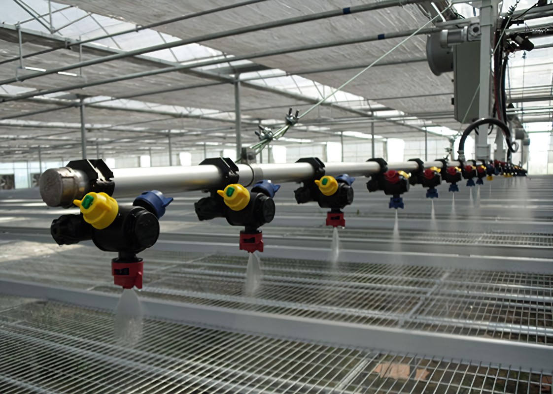 噴灌機,利用微電腦和磁性號進行控制,并加以遙控裝置,自動化程度很高,懸掛在溫室上部的雙 軌道管上,能夠根據用戶的選擇實現:正向運行、反向運行、連續(xù)噴灌,及相應的正向噴淋、反向噴淋以及往返噴淋。噴灌機為雙臂噴灌管,每個噴頭有三種不同流量和霧化程度的噴嘴,輕輕轉動該噴頭就可選擇合適的噴嘴。