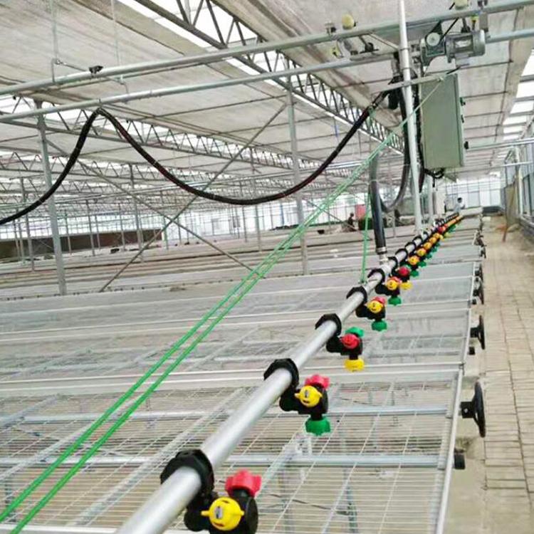 可以選擇使用噴灌機轉移系統,噴灌機可以越跨進行灌溉工作,從而用一臺噴灌機完成多跨溫室的灌溉任務,以節(jié)約投資。